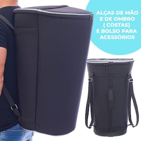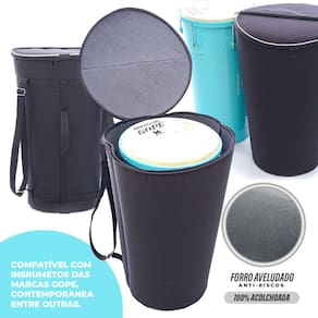 Compatível com rebolo ou tan tan de 12 x 60 cm Dimensões internas aproximadas: 32 cm de diâmetro por 60 cm de altura Material externo: nylon 600 rip-stop com resinagem interna Material interno: forro em suede aveludado cinza Espuma: 10 mm de poliuretano de alta densidade, acolchoamento total Alças: duas alças mochila reguláveis e uma alça de mão superior Bolso superior: 60 x 20 cm Peso aproximado: 1,2 kg Cor: preto com detalhes cinza Compatibilidade com marcas como Gope, Contemporânea, Izzo, Luen, Timbra, RMV e outras com medidas padrão 12 x 60 cm O que acompanha o produto: 1 unidade da case mochila acolchoada Observação: instrumento, baquetas e acessórios não acompanham o produto