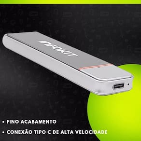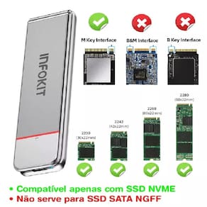 Case para SSD M.2 Converte o Driver SSD M2 em interface USB 3.1. Design elegante, compacto e portátil em liga de alumínio sendo ultra resistente e leve, garantindo uma melhor experiência com performance e velocidade de transmissão. Usando esta case será mais prático utilizar SSD M.2 como armazenagem externo, proporcionando mais liberdade e praticidade. Conexão USB 3.1 e Type-C com taxas de transferência ultrarrápidas de 10 Gb/s. Compatível com SSD M.2 de protocolo NVMe (Pcie) e SATA (NGFF), ou seja, todos modelos disponíveis no mercado. Suporta SSD's de 22x30 / 22x42 / 22x60 / e 22x80 mm. Compatibilidade de sistemas: Windows SE/ME/2000/XP/Vista/7/8/10 ou superior LED indicador de utilização.
