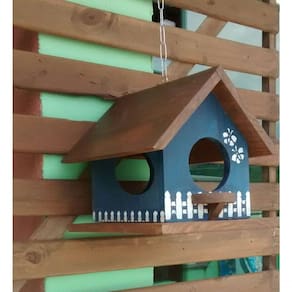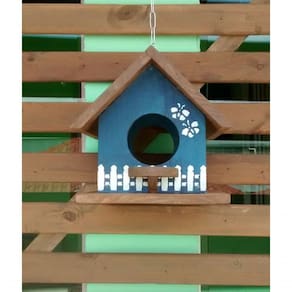 Casinha de pássaro comedouro para varanda e jardim.Feita com madeira maciça de reflorestamento, é decorada artesanalmente.Cor: AzulCom acabamento encerado, resiste ao tempo!Altura: 0.27 cmLargura: 0.30 cmComprimento: 0.25 cmPeso: 4000 g