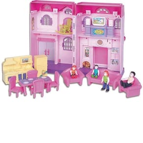 Vem com suíte, varanda, sala e cozinha e vários móveis. Casinha que abre para brincar dentro dela, com som de campainha e latido de cachorro. Acompanha móveis da sala de estar, sala de jantar, cozinha e 4 bonecos semi-articulados.