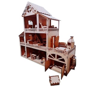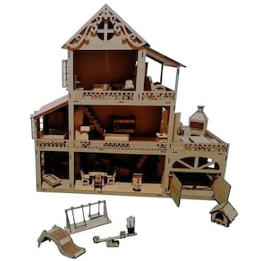Kit contém: 1 casa de bonecas de madeira tipo MDF Crú com Garagem e Varanda Gourmet