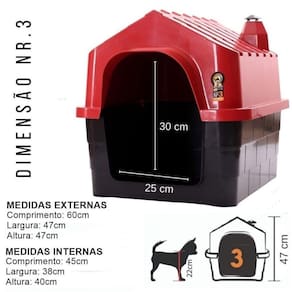 Casinha para Cachorros com Chaminé Durapets Nº3 A casa da Durapets, é ultra resistente e de qualidade, uma casa com boa durabilidade e confortável para o seu cãozinho. Possui uma chaminé para entrada e saída de ar, evitando possíveis odores. Ainda conta com um design moderno e aconchegante, tudo pensado no conforto diário do seu pet. A DuraHouse Nº3 foi projetada para cães de raças médias. O telhado tem tratamento UV que protege o pet de raios ultravioletas Fácil de montar e desmontar com seu sistema de fechamento de encaixe, easy-click Material: plástico 100% reciclável. Cores Disponíveis: Azul, Laranja, Rosa, Vermelho e Preto. MEDIDAS EXTERNASComprimento: 60cm Largura: 47cm Altura: 47cm MEDIDAS INTERNASComprimento: 45cmLargura: 38cmAltura: 40cm PORTAAltura: 30cmLargura: 25cm Wow