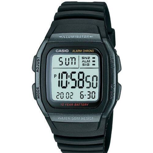 Material do corpo/anel: resina Pulseira em Resina Vidro Resina / Vidro Esférico Até 50 metros resistente à água Fundo luminoso LED, Persistência luminosa Hora dupla Cronômetro de 1/100 segundo Capacidade de medição: 23:59'59.99'' Modos de medição: Tempo transcorrido, divisão de tempo, hora no 1 e 2 ponto Alarmes multi-funcionais (1 ou 7 sonecas) sinalização a cada hora Calendário automático (até o ano 2099) Formatos 12/24 horas Horário regular: Hora, minutos, segunda, pm (post meridiem), ano, mês, data, dia Precisão: +-30 segundos por mês Duração da bateria: 10 anos com CR2025