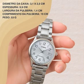 Ficha Técnica Marca: Casio Modelo: LTP-V002D Movimento: Analógico Material da Caixa: Metal Material da Pulseira: Aço Inoxidável Resistência à água: 3 ATM (30 metros) Formato: Redondo Gênero: Feminino Estilo: Casual Diâmetro da caixa: 3,1 x 2,5 cm Espessura: 0,9 cm Largura da pulseira: 1,4 cm Comprimento da pulseira: 19 cm Peso: 53 g