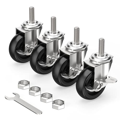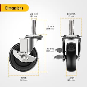 Especificações: - Diâmetro da haste: 3/20.3 cm - Comprimento da haste: 1-1/5.1 cm - Diâmetro da roda: 7,6 cm - Altura total: 12,7 cm - Largura da roda: 2,5 cm - Capacidade total: 272 kg - Material da roda: Borracha termoplástica em poliolefina - Tipo de freio: Parte superior: Trava lateral - Trava giratória: Trava de combinação com freio CARACTERÍSTICAS Características: - Estrutura resistente para alta capacidade de carga - Cabeça giratória para movimento contínuo e ininterrupto - Rodas duráveis com propriedades de desgaste extremamente baixas - Rodas ergonomicamente amigáveis com resistência ao rolamento otimizada para aliviar a carga para o usuário - Ótimo para carrinhos, armários de armazenamento, suportes de exibição, mesa de trabalho, carrinho, etc. Conteúdo da embalagem: - 4 rodízios de haste - 4 porcas - 1 chave inglesa. - Garantia de devolução do dinheiro em 30 dias - Garantia de 1 ano - Construção estável: caixa feita de aço resistente para alta carga, o conjunto de capacidade máxima de 4 rodas é de até 272 kg. O freio de travamento lateral pode manter o equipamento firmemente no lugar para reduzir acidentes. - Especificação da haste do parafuso: Rodízios giratórios de travamento de 7,6 cm, 3/20.3 cm -16UNC x 1-1/5.1 cm (diâmetro da haste 3/20.3 cm, comprimento da haste 1-1/5.1 cm) Rodízios de haste rosqueada, rodízios sem ruído conjunto de 4 rodízios. - Rodas de borracha termoplástica que não estragam: não tóxicas e ecológicas, resistentes à maioria dos solventes. O passeio acolchoado com absorção de choque oferece proteção ao chão e operação silenciosa de rolamento. - Multiuso: estas rodas giratórias podem ser colocadas em bancadas de trabalho, caixas de instrumentos, mesas de arte e muito mais. Seja qual for o seu local de trabalho que precise de ajuda para tornar móvel, nossas rodas para carrinho são uma solução rápida. Equipadas com cabeça giratória de 360 graus, as rodas giratórias podem responder imediatamente às mudanças de direção. - Garantia de qualidade: confirme o tamanho da haste antes de comprar, para evitar erros de compra. 1 ano de serviço de reparo, garantia de devolução do dinheiro em 30 dias, substituição sem custos, sem perguntas.