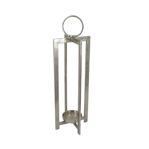 Castiçal de lanterna Benjara Siana, 27 polegadas de altura, estrutura metálica com acabamento prateado — um castiçal de lanterna. Construção metálica durável com acabamento prateado.