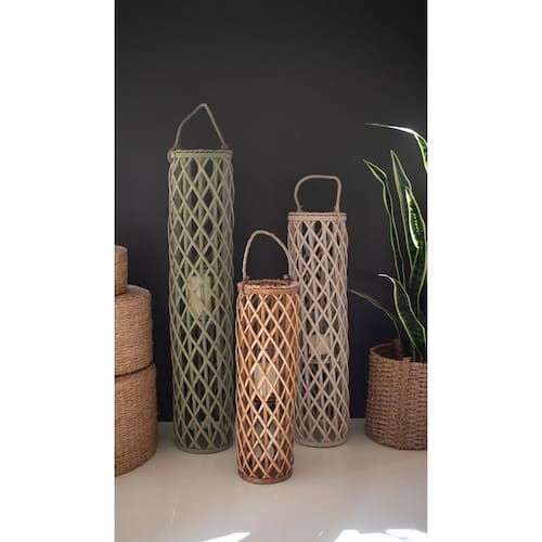CONJUNTO DE TRÊS LANTERNAS DE SALGUEIRO COM INSERÇÕES DE VIDRO - UMA CADA/P>