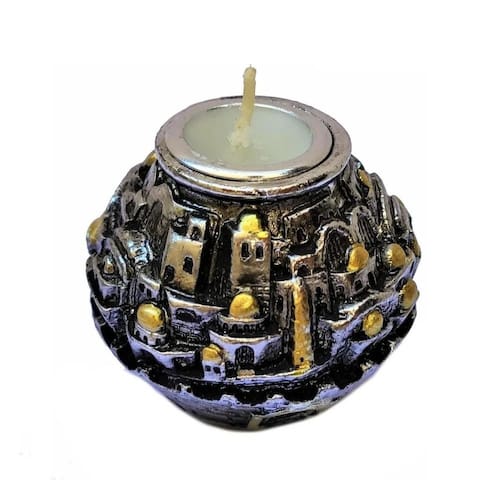 01 Castiçal Para Shabat prateado com desenho da cidade de Jerusalém.