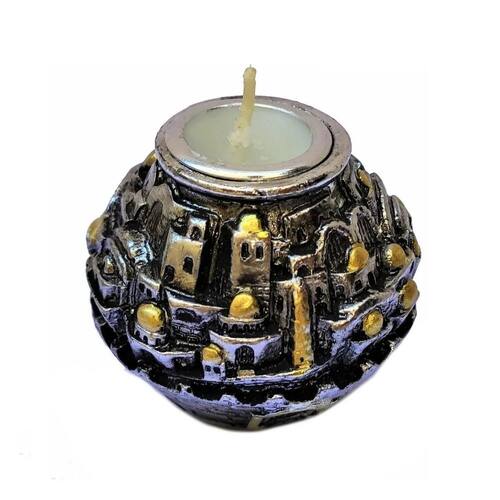 01 Castiçal Para Shabat prateado com desenho da cidade de Jerusalém.