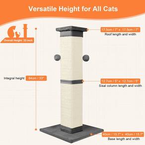 - Altura impressionante: nosso poste arranhador para gatos tem 84 cm, oferecendo amplo espaço vertical para seu amigo felino explorar. Equipado com hastes de sisal largas de 12,7 cm de comprimento, oferece uma área expansiva para arranhões, permitindo que seu gato se estique e arranhe o quanto quiser.