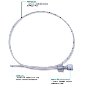 Cateter umbilical mono ou duplo lúmen em poliuretano de alta hemocompatibilidade e ponta distal arredondada.