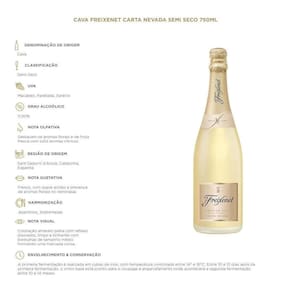 Cava Freixenet Carta Nevada Semi Seco 750ML Kit 03 Unidades Produzido desde 1941, Freixenet Carta Nevada é refrescante e muito bem equilibrado. Possui sabor levemente adocicado com ligeiros aromas florais e harmoniza bem com aperitivos e sobremesas. A primeira fermentação é realizada em cubas de inox, com temperatura controlada entre 14 e 16C. Entre 10 e 12 dias após a primeira fermentação, o vinho base está pronto para o coupage e engarrafamento onde acontecerá a segunda fermentação entre 10 e 14 meses. Atributos do Produto: Referência: 101004 Código: B00201KIT03 Código de Barras: 7898888801153 Cor: Amarelo Produtor: Freixenet País: Espanha Denominação de origem: Cava Classificação: Espumante Semi Seco Uva: Macabeo, Parellada, Xarello Grau alcoólico: 11,5% Região de origem: Sant Sadurní d'Anoia, Catalunha, Espanha Harmonização: Aperitivos e sobremesas Detalhes e Especificações Técnicas: Destacam-se aromas florais e de fruta fresca com sutis aromas cítricos. Fresco, com suave acidez e presença de aromas florais no retronasal. Coloração amarelo palha com reflexo dourado, limpo e brilhante com borbulhas de tamanho médio formando uma marcada coroa. Conteúdo da Embalagem: 03 Unidades de Espumante Cava Freixenet Carta Nevada Semi Seco 750ML Importante Produtos de decoração não inclusos. Imagens meramente ilustrativas; As cores dos objetos podem sofrer alterações devido a luminosidade, configurações do monitor e até mesmo a percepção do usuário; Os dados divulgados são de responsabilidade do fabricante/fornecedor.