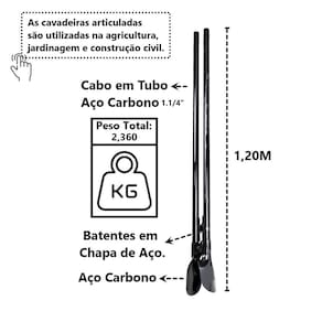 Cavadeira Standard Articulada Cabo Tubo em Aço Carbono 120cm, a cavadeira articulada tem esse nome em função da articulação que se destaca na sua extremidade responsável pelo trabalho de escavação. Formando uma espécie de bico, a ferramenta abre e fecha como um tipo de tesoura, ?abocanhando? porções de terra conforme é inserido no solo.