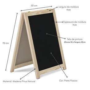 Destaque promoções, cardápios e mensagens com elegância e praticidade! O Cavalete de Calçada Standard é a solução ideal para bares, restaurantes, cafeterias, padarias, lanchonetes, supermercados, açougues e comércios em geral. Sua moldura em madeira pinus mogno combina perfeitamente com ambientes rústicos, enquanto o quadro preto fosco realça a escrita com giz branco ou colorido.