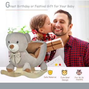 Cavalinho de balanço para crianças Qaba, em formato de urso de pelúcia com som, base de madeira e cinto de segurança para 18 a 36 meses, cinza.