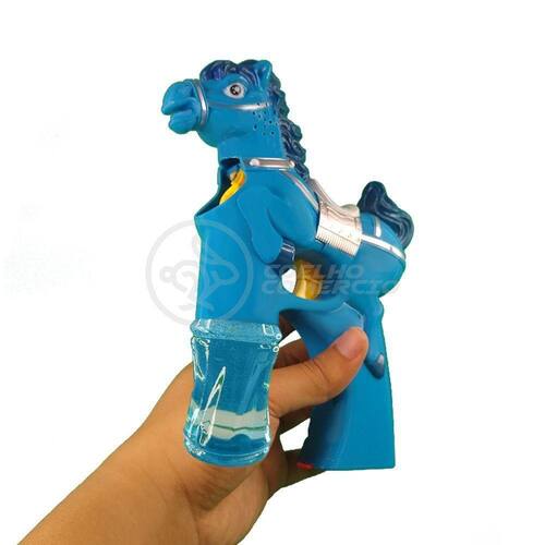 Em um recipiente, despeje a água e coloque sabão, mergulhe o brinquedo de bolha e é só pressionar.