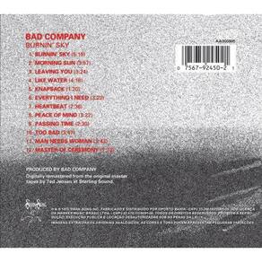 Cd bad company - burnin' sky Produto nacional - embalagem em jewelbox caixa acrílica + encarte com 4 páginas sem as letras das músicas + slipcase luva especial - lançamento mundial 03/03/1977 O quarto álbum de estúdio da banda, foi gravado na frança no château d'hérouville, em julho e agosto de 1976. Com o engenheiro de som, chris kimsey que se tornou o engenheiro de som do rolling stones. O álbum foi remasterizado e relançado em 1994, a capa é semelhante ao poster do filme de sam pechinpah the wild bunch, de 1969. No filme almost famous de 2000, a primeira camiseta da banda fictícia stillwater é muito semelhante a capa do álbum birnin' sky. Tracklist: 01 - burnin' sky 05:19 02 - morning sun 03:57 03 - leaving you 03:24 04 - like water 04:18 05 - knapsack 01:20 06 - everything i need 03:22 07 - heartbeat 02:38 08 - peace of mind 03:22 09 - passing time 02:30 10 - too bad 03:37 11 - man needs woman 03:48 12 - master of ceremony 07:10 Marca: Não Informado