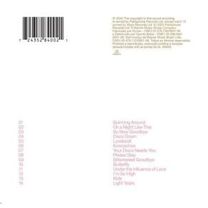 Tracklist: 01- password 03:50 02 - spinning around 03:26 03 - on a night like this 03:31 04 - so now goodbye 03:36 05 - disco down 03:56 06 - loveboat 04:09 07 - koocachoo 04:00 08 - your disco needs you 03:31 09 - please stay 04:04 10 - bittersweet goodbye 03:43 11 - butterfly 04:08 12 - under the influence of love 03:21 13 - i'm so high 03:33 14 - kids 04:19 15 - light years 04;47