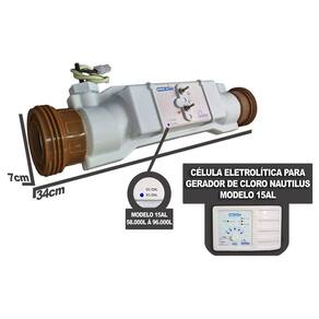 Célula autolimpante para o gerador de cloro nautilus 15 AL, indicado para o tratamento de piscinas residenciais (com volume de 58.000 à 96.000 litros) ou comerciais (com volume de 38.000 à 54.000 litros).