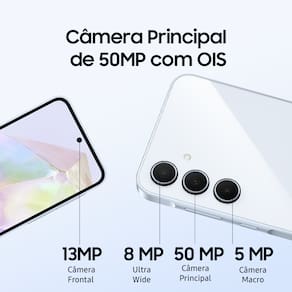 O Galaxy A35 5G é o celular ideal para aqueles que gostam de explorar e interagir com os conteúdos e tendências mais recentes. Com o seu design premium em vidro e resistência a água e a poeira (IP67), esse aparelho traz estilo e proteção para o seu dia a dia. E você tem 3 opções de cores para escolher a que mais combina com você: Azul Escuro, Azul Claro e Rosa. A sua Câmera Tripla de até 50MP e Selfie de 13 MP garantem diversas possibilidades para que as suas fotos fiquem de outro nível. O modo retrato noturno do Galaxy A35 5G permite capturar o melhor de si, todas as noites. Já seus vídeos ficarão super-estáveis, mesmo gravados em movimento, e com mais detalhes e clareza, graças ao HDR, que captura um amplo espectro de luz e sombra. Com Nightography, você não precisa se preocupar em tirar fotos em ambientes com pouca luz, pois ele garante brilho nessas situações. E você ainda pode utilizar o Apagador de Objetos caso queira remover elementos indesejados em suas fotos. A tela Super AMOLED FHD+ de 6.6” é brilhante e colorida, garantindo uma visualização imersiva nos conteúdos. E para mais fluidez, esse celular tem uma taxa de atualização de até 120Hz. Assim, você assiste a sua série preferida, acompanha as redes sociais e consome mídia da melhor forma, mesmo sob a luz do sol, pois o Vision Booster preserva os detalhes e aumenta a sua qualidade de visualização. A tela Infinity-O Display permite mais espaço para visualização e um aspecto premium ao celular. O Galaxy A35 5G te acompanha em todos os momentos com a sua bateria de longa duração de 5.000 mAh e um Carregamento super-rápido de até 25W, para que você não precise passar muito tempo ao lado da tomada. E aos que gostam de game, experimente uma velocidade e desempenho absurdos, com processador Octa-Core com armazenamento de até 256GB e memória RAM de até 8GB. Para uma experiência duradoura e segura com o seu aparelho, O Galaxy A35 5G assegura até 4 atualizações de sistema operacional Android e até 5 anos de atualizações de Segurança. Fora isso, a sua proteção é aprimorada com Samsung Knox, garantindo que dados confidenciais e sigilosos permaneçam seguros, e com Cadeado Galaxy, protegendo os seus dados e acessos a aplicativos por terceiros. Com o aplicativo Smart Switch você transfere de forma fácil e prática o conteúdo do seu celular anterior (fotos, contatos, eventos do calendário, notas, configurações do dispositivo e muito mais) para o novo Galaxy A35 5G.