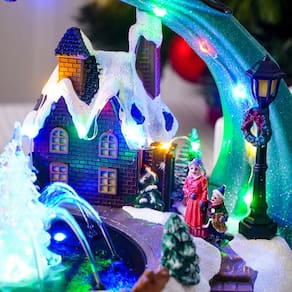 O Cenario Vila Natalina Musical Natal, possui fonte de água, perfeito para encantar as crianças e toda a sua família.