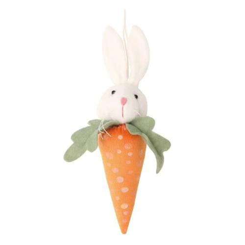 Enfeite para pendurar em formato de cenoura com cabeça de coelho. Branco, laranja e verde