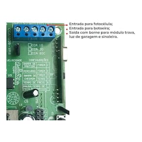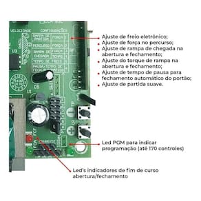 Modelo:CCA-10 Bivolts 127/220V Cadastra até 340 Botões de Controles Led´s indicadores de fim de curso abertura/fechamento Led PGM para indicar programação. Sistema:Code Learning, Rolling Code,Hope Code e Flex Code Entrada para fotocélula Entrada para botoeira Saída para módulo trava/luz de garagem (MTLG-RCG) Saída 12V/GND (para fotocélula RCG) Ajuste de freio eletrônico Ajuste de força(embreagem) Ajuste de tamanho de rampa (abertura e fechamento) Ajuste de torque de rampa (Abertura e fechamento) Ajuste de tempo de pausa (fechamento automático) Ajuste de partida suave Medidas: 85mm x 75mm Fabricante RCG