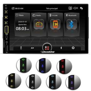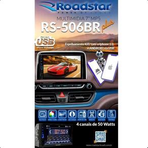 Central multimídia 2 din mp5 7pol full touch bluetooth micro sd aux usb com controle remoto rs-506br plus - roadstar Conectividade:Com a multimidia rs-506br plus você poderá curtir suas mídias de audio ou vídeo através da entrada usb ou de cartão micro sd. Através da conexão bluetooth você pode atender, ou efetuar, suas chamadas telefônicas e também reproduzir suas playlists de seu celular direto na rs-506br plus. Tela de 7 full touch:A multimídia mp5 rs-506br plus possui botões com 7 cores de iluminação e tela de 7 full touch com uma interface intuitiva e amigável. Espelhamento:Você pode espelhar seu celular com sistema android ou ios Diretamente na tela da rs-506br plus através do cabo usb. Espelha android a partir da versão 5 e iphone até a versão 13 . Características:- marca: roadstar- modelo: rs-506br plusImagens meramente ilustrativas Especificações técnicas:- painel: fixo com botões em 7 cores de iluminação azul, azul claro, branco, amarelo, vermelho, roxo e verde - tela: full touch 7 capacitiva- rádio: fm com memória para 18 estações fm- conexões: bluetooth- entradas frontais: micro sd, auxiliar e 2 usb's 1 charger e 1 player - entradas traseiras: 1 vídeo auxiliar, 1 câmera de ré, 1 auxiliar e 1 microfone externo- saídas: 2 rca audio e 2 rca vídeo - tipo de conector: iso- controle remoto: sim físico e por aplicativo para android - comando de volante: sim em alguns modelos de carros poderá ser necessário o uso de interface - potência: 4 canais de 50 watts rms Conteúdo da embalagem:- 1x central multimídia rs-506br plus- 1x chicotes para instalação- 1x controle remoto