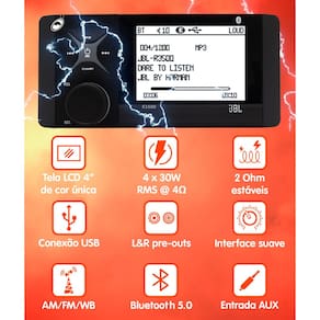 Leve entretenimento e conectividade para seu barco ou veículo com a Central Multimídia Marinizada JBL R3500. Projetada para resistir às condições mais adversas, essa central oferece um som potente e de alta qualidade com a assinatura JBL, perfeita para ambientes náuticos. Com funções de áudio importantes, ela conta com conectividade Bluetooth, USB e rádio AM/FM, permitindo que você curta suas músicas favoritas em qualquer lugar, com máxima durabilidade e proteção contra água e poeira.