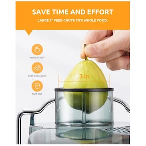 O espremedor equipado com motor de 800W extrai 27 mais suco, 38 mais vitaminas e minerais. Com esta máquina de suco, uma xícara de suco caseiro com menos polpa e espuma será feita em apenas alguns segundos. Além disso, um jarro de suco de 500 mL e uma escova de limpeza estão incluídos Economize tempo de preparação A exclusiva calha de alimentação extra larga de do espremedor centrífugo permite que você pule o pré corte, para suco de frutas e vegetais inteiros. A instalação fácil pode ser instalada em apenas várias etapas, o que é amigável para jovens e idosos. Todos os designs são para você e sua família beberem suco saudável mais rápido. Sistema de velocidade dupla O extrator de suco com sistema de velocidade dupla oferece controle total sobre as frutas e vegetais mais macios ou mais duros. baixa velocidade, 13000 15000 RPM, para frutas macias como laranja, tomate e outros Velocidade rápida , 16000 18000 RPM, para frutas duras como maçã, aipo, cenoura, couve e outros. Separador de espuma embutido É normal que certas frutas ou vegetais espumem enquanto espremem em alta velocidade. O jarro de suco possui um separador de espuma integrado para despejar mais suco no copo, reduzindo o entupimento e a formação de espuma. Recursos de segurança O braço de travamento de segurança impede que a máquina de suco funcione sem a tampa travada no lugar. A proteção contra sobrecarga e superaquecimento desliga automaticamente o espremedor, garante a segurança e prolonga a vida útil. Existem pés antiderrapantes na parte inferior da máquina para evitar que a máquina vibre. Fácil de limpar Inclua uma escova especial para tornar a limpeza mais fácil e rápida. Todas as partes removíveis do espremedor de aipo são laváveis na máquina de lavar louça e livres de BPA. Enquanto você ainda está desfrutando do suco, as peças foram bem limpas. O bico com design anti gotejamento pode impedir que as máquinas de espremedor pingem e manter a bancada limpa. Material de grau culinário O disco de corte e o filtro de malha do espremedor de boca grande são todos feitos de aço inoxidável 304 premium. O jarro de espremedor de plástico e o coletor de polpa são feitos de material e livre de BPA de qualidade alimentar