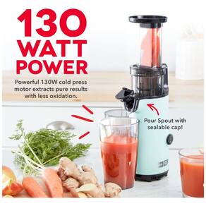 Centrífuga de frutas DASH DCSJ255 turquesa, 110V, com função de separação de suco e celulose, design compacto e acessório para sorvete.