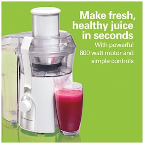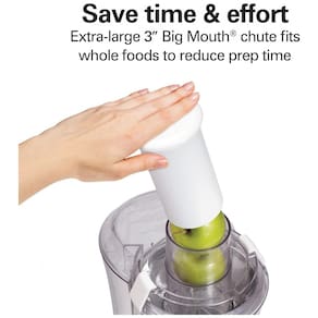Centrífuga de frutas Hamilton Beach com motor de 800W, bocal grande de 3 polegadas, filtro de micromesh em aço inoxidável e peças removíveis para fácil limpeza.Vendido e entregue por Ecletiq