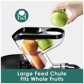 O espremedor lento Fretta é equipado com um design conveniente de calha de alimentação dupla, permitindo adicionar simultaneamente vários ingredientes, economizando tempo e esforço no processo de suco. Com apenas um toque de um botão, o corpo do suco se destaca facilmente, permitindo uma limpeza conveniente em água corrente. A função reversa evita efetivamente o entupimento durante o processo de extração do suco e simplifica a limpeza, garantindo uma experiência tranquila e descomplicada