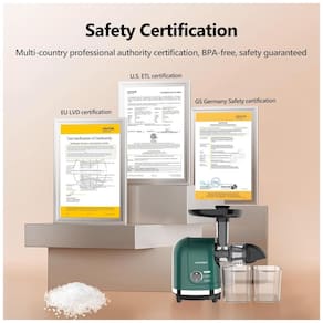 Todas as peças destacáveis são feitas de matéria prima de alta qualidade, sem BPA, seguras para uso a longo prazo. O motor de 200 W é potente para fazer suco de maçã, aipo, laranja, salsa, espinafre, couve, grama de trigo, beterraba e cenoura. Montagem com um clique, sem necessidade de ferramentas. Motor silencioso e design horizontal robusto.