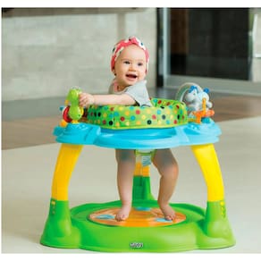 Para crianças entre 6 e 18 meses Assento giratório em 360º, possibilitando que a criança gire o corpo e alcance todos os brinquedos. Brinquedos diversos localizados na base superior, com luzes, sons e movimentos divertidos. Assento totalmente acolchoado, em tecido macio e de fácil limpeza. Bandeja musical (alimentada por pilhas), contendo musicas variadas. Plataforma removível que transforma-o em mesa ou pula-pula. Altura regulável em três posições.