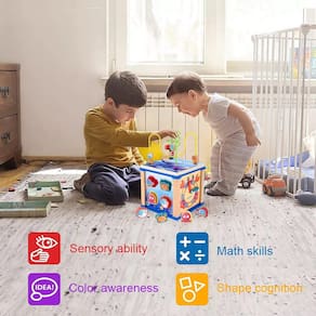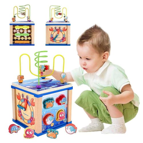 - [Cubo de atividades 5 em 1 para bebês] Cada lado deste pequeno cubo de atividades tem suas próprias atividades coloridas e fascinantes: engrenagens giratórias, labirinto de miçangas, relógio de aprendizado, ábaco de 5 cores, blocos de construção de 4 cores. Este cubo de atividades infantis é muito divertido e visa promover as habilidades de contagem, cores, padrões e cognição de formas das crianças, mantendo as crianças ocupadas por 1 a 3 dias!