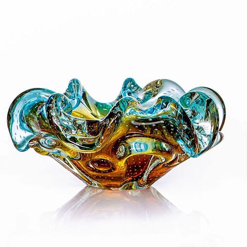 Centro De Mesa Em Cristal Murano Azul E Ambar São MarcosComprimento:22cmLargura:22cmAltura:10cmPeso:2710gProduzida 100% artesanalmente com a técnica secular e originária da Itália, a qual com muita maestria e criatividade são desenvolvidas e preservadas no Brasil pela Cristais São Marcos desde 1962. As escolhas das peças são versáteis e podem ser usadas para decorar casas e ambientes dos mais variados estilos. A tradição do Cristal Murano e a inovação em detalhes, formas e cores, trazem requinte para a decoração. O colorido do Muranoem especial, torna-se um coringa na decoração e produzem um efeito muito bonito em locais com luz natural, não dependendo de nenhum outro elemento para se destacar. As peças em Cristal Murano, são atemporais, aposte nelas como a estrela da decoração ou ainda para harmonizar em combinações com diferentes artigos para compor um ambiente. Junto com as peças em Murano, leve ainda um pouco de história. Uma dica é misturar diferentes Muranos e criar sua coleção de arte particular. O cristal Murano, tornou-se objeto de desejo por suas características únicas. Sendo assim, com todas essas particularidades, ele é uma ótima escolha para decorar, colecionar e ainda presentear com classe e sofisticação.