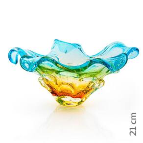 Centro De Mesa Em Cristal Murano Azul E Ambar São Marcos Comprimento:45cm Largura:45cm Altura:21cm Peso:8300g Produzida 100% artesanalmente com a técnica secular e originária da Itália, a qual com muita maestria e criatividade são desenvolvidas e preservadas no Brasil pela Cristais São Marcos desde 1962. As escolhas das peças são versáteis e podem ser usadas para decorar casas e ambientes dos mais variados estilos. A tradição do Cristal Murano e a inovação em detalhes, formas e cores, trazem requinte para a decoração. O colorido do Murano em especial, torna-se um coringa na decoração e produzem um efeito muito bonito em locais com luz natural, não dependendo de nenhum outro elemento para se destacar. As peças em Cristal Murano, são atemporais, aposte nelas como a estrela da decoração ou ainda para harmonizar em combinações com diferentes artigos para compor um ambiente. Junto com as peças em Murano, leve ainda um pouco de história. Uma dica é misturar diferentes Muranos e criar sua coleção de arte particular. O cristal Murano, tornou se objeto de desejo por suas características únicas. Sendo assim, com todas essas particularidades, ele é uma ótima escolha para decorar, colecionar e ainda presentear com classe e sofisticação. Ean: 7894728695807