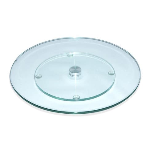 Altura: 2cm Diâmetro: 40cm Base giratória: 3,5cm Espessura do vidro: 8mm Material: vidro e rolamento de alumínio Suporta até 10kg Cor: cristal