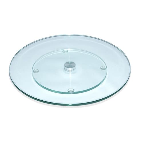 altura: 2cm diâmetro: 40cm base giratória: 3,5cm espessura do vidro: 8mm material: vidro e rolamento de alumínio suporta até 10kg cor: cristal