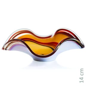 Centro Onda Em Cristal Murano Âmbar - São Marcos 40cm Centro Onda Em Cristal Murano Âmbar - São Marcos é uma peça decorativa produzida 100% artesanalmente com a técnica secular e originária da Itália, a qual com muita maestria e criatividade são desenvolvidas e preservadas no brasil pela Cristais São Marcos desde 1962. A tradição do cristal murano e a inovação em detalhes, formas e cores, trazem requinte para a decoração. O colorido do murano em especial, torna-se um coringa na hora de decorar e produz um efeito muito bonito em locais com luz natural, não dependendo de nenhum outro elemento para se destacar. As peças em cristal murano, são atemporais, aposte nelas como a estrela da decoração ou ainda para harmonizar em combinações com diferentes artigos para compor um ambiente. FICHA TÉCNICA Marca: São Marcos Modelo: Centro Onda Em Cristal Murano Âmbar - São Marcos Ref.: 2171LAB Material: Cristal Murano Medidas A x C x L : 14 X 40 X 40 cm Peso: 4,250 Conteúdo Da Embalagem: 01 Centro Onda Em Cristal Murano Âmbar - São Marcos Junto com as peças em murano, leve ainda um pouco de história. Uma dica é misturar diferentes muranos e criar sua coleção de arte particular. O cristal murano, tornou-se objeto de desejo por suas características únicas. Sendo assim, com todas essas particularidades, ele é uma ótima escolha para decorar, colecionar e ainda presentear com classe e sofisticação. IMPORTANTE: Produto produzido de forma artesanal, são admitidas nas características finais do processo de produção desse produto pequenas variações de peso, formato, cor e ainda o aparecimento de minúsculas bolhas de ar, típicas do cristal murano.