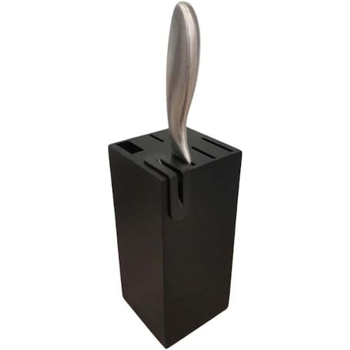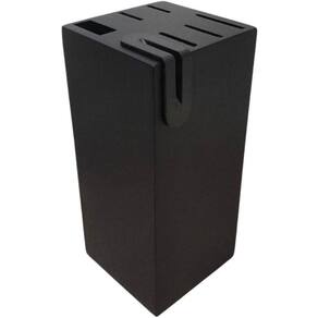 Peça feita em madeira na cor preta com 6 espaços para facas e tesoura, material de qualidade, o porta faca com afiador oferece design elegante e único, podendo ser utilizado para facilitar o dia a dia na cozinha ou no seu churrasco do fim de semana.