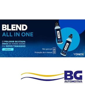 Cera Polidora Blend All in One 240ml - Vonixx A principal função desse produto é facilitar o polimento para uma única etapa e além disso fornecer limpeza, brilho e proteção ao seu veículo. Blend All In One é um polidor de etapa única com proteção, que alia o brilho da carnaúba e a resistência cerâmica do SiO2, promovendo também hidrorrepelência na pintura. Seu alto poder de corte elimina riscos e swirls médios a severos comparável a marcas de lixa P2000 ou mais finas . -fornece limpeza, brilho e proteção; -pronto para Uso; -ótimo acabamento; -elimina riscos e swirls médios a severos; -não gera pó; -proteção de até 4 meses; -indicado para pintura e faróis;