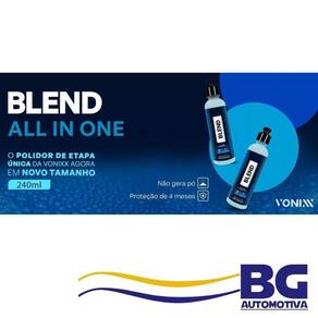 Cera Polidora Blend All in One 240ml - Vonixx A principal função desse produto é facilitar o polimento para uma única etapa e além disso fornecer limpeza, brilho e proteção ao seu veículo. Blend All In One é um polidor de etapa única com proteção, que alia o brilho da carnaúba e a resistência cerâmica do SiO2, promovendo também hidrorrepelência na pintura. Seu alto poder de corte elimina riscos e swirls médios a severos comparável a marcas de lixa P2000 ou mais finas . -fornece limpeza, brilho e proteção; -pronto para Uso; -ótimo acabamento; -elimina riscos e swirls médios a severos; -não gera pó; -proteção de até 4 meses; -indicado para pintura e faróis;