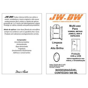 limpeza a seco, cristalização, brilho e proteção que repele a sujeira de vidros e metais. Acabamento impecável para box de banheiros, janelas, metais e muitas outras superfícies protege a pintura criando uma película protetora com duração média de 1 até 2 meses de ação hidrorrepelente. Benefícios: - zero de água para lavar o seu carro - sustentável, não agride o meio ambiente - pode ser utilizado para limpar fogão, geladeira com menos esforço - pode ser utilizado em plásticos, vidros e metais em geral. - dá brilho em metais. Modo de aplicar: usar duas flanelas de microfibra, uma para aplicar o produto e tirar a sujeira e outra sem o produto para finalizar o brilho e proteção. Utilizar o produto sempre na sombra e com a pintura fria. Produto biodegradável sem abrasivos e ecologicamente correto. Composição: cera microcristalina, cristalizador de vidro, antioxidantes, água deionizada, fragrância, emulsionante alcalinizante, aditivos e conservantes. Marca: Jw-Dw