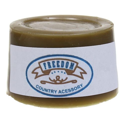 Cera na qualidade Freedom para sovar a corda e dar maior fixação na hora da montaria, composta da fusão de cera de abelha, breu e outras substâncias fixantes.