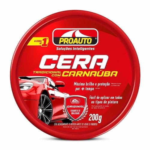 A Cera Tradicional Proauto proporciona maior brilho e proteção à pintura de veículos. Remove manchas pequenos riscos e tinta oxidada. Sua fórmula com Carnaúba e silicones especiais forma uma película protetora que repele a sujeira e protege contra as ações do tempo (sol, chuva, maresia, e etc.). Indicado para todos os tipos de pintura.