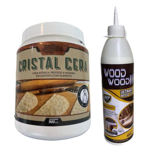 Neste anúncio você compra:- 1 pote da Cristal Cera Wood Wood de 900ml- 1 Cola Wood Wood Madeira 497 gA Cristal Cera é uma cera atóxica de acabamento acetinado que protege a madeira do ressecamento e rachaduras ocasionados pelo uso constante de forma natural. Forma uma película protetora aumentando a durabilidade e realçando a cor e as fibras da madeira.BenefíciosPode cobrir as rachaduras e reduzir riscos nas superfícies. Aumenta a resistência à água. Produto atóxico, 100% natural, pode ter contato indireto com alimento. Aumenta o brilho. Odor agradável. Fácil aplicaçãoIndicaçãoPolir, reparar e restaurar a beleza em todos os tipos de madeira como móveis de madeira maciça, artesanato em madeira maciça, tabua de corte, com ou sem acabamento.Preparação da superfícieEliminar todo pó, manchas de gordura ou graxa, mofo, partes soltas e deixar a madeira livre de qualquer impregnação que possa prejudicar a aderência do produto ao substrato. Lixar com grana 180-240, lavar e secar a madeira para deixá-la firme. Caso a madeira não tenha acabamento, aplicar o Cristal óleo para aumentar a proteção contra a umidade.Aplicação do produto: Com o auxílio de um algodão limpo, esponja não abrasiva branca ou com lã de aço aplicar a Cristal cera sobre toda a superfície, aplicar em camadas finas no sentido dos veios da madeira e esfregar até absorção total do produto, utilizar um pano limpo para retirar o excesso, aguardar a secagem do produto de 10 a 15 minutos e retirar o excesso garantindo uma aplicação uniforme, após 2 horas, aplicar a segunda demão. Não diluir. Aplicar duas demãos. Em peças de uso frequente aplicar uma vez ao mês, em peças com pouco uso, aplicar a cada seis meses. Após a aplicação a madeira pode ser limpa com água e detergente. Evite cortar carne fresca diretamente sobre a madeira para evitar contaminação. Coloque um filme plástico sobre a madeira para proteção.Composição: Cera natural de abelha e óleo mineral USPRendimento: Aproximadamente 17m por litro. Pode variar de acordo com a absorção da madeira.Tempo de secagem: Entre demãos 2 horas, total 2 horas.Validade: 18 meses a partir da data de fabricação.Limitações: Este produto não deve ser aplicado em superfícies esmaltadas, enceradas, vitrificadas ou não porosas. Não deve ser aplicado em locais que liberam óleo, plastificantes ou solventes gaxetas de vedação de borracha natural ou parcialmente vulcanizadas ou fitas; em superfícies cuja temperatura esteja abaixo de 10ºC ou acima de 37ºC. Produto não recomendado para pisos e escadas. Não aplicar o produto em excesso.