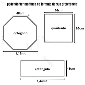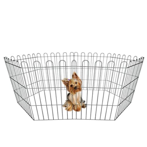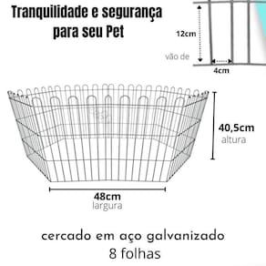 DescriçãoCercadinho para PET de pequeno porteÓtimo para limitar o espaço para o seu animalzinho.Possui 8 folhas, que já vão conectadas. Pode ser montado no formato octogonal, quadrado, retângulo ou utilizado em formato linear.Dobrável, é muito fácil de guardar, armazenar e transportar.Comprimento total linear : 3,84 metrosOs vãos medem aproximadamente 4cm x 12,5cmMaterial: Aço galvanizadoEspessura: 2 mmPara animalzinho de pequeno porte: cães pequenos, filhotes, coelho, galinha, porquinho da Índia. Cercado dobrávelProduto pode ficar redondo, quadrado, retangular enfim. Tamanho Padrão 1M 8 folhas de 48cm