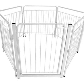 Especificações Técnicas: - Modelo: Cercado Dobrável Portátil de 6 Lados com Portão incluso - Material: Aço - Cor: Branco ou preto - Tratamento antiferrugem - Dimensões do produto dobrado embalado: 13 x 69 x 69 cm - Dimensões do cercado fechado: ocupa um espaço de 135 x 135 cm com altura de 69 cm - Dimensões do cercado aberto: forma uma linha reta com comprimento de 4,3 metros - Peso: 6,915 kg